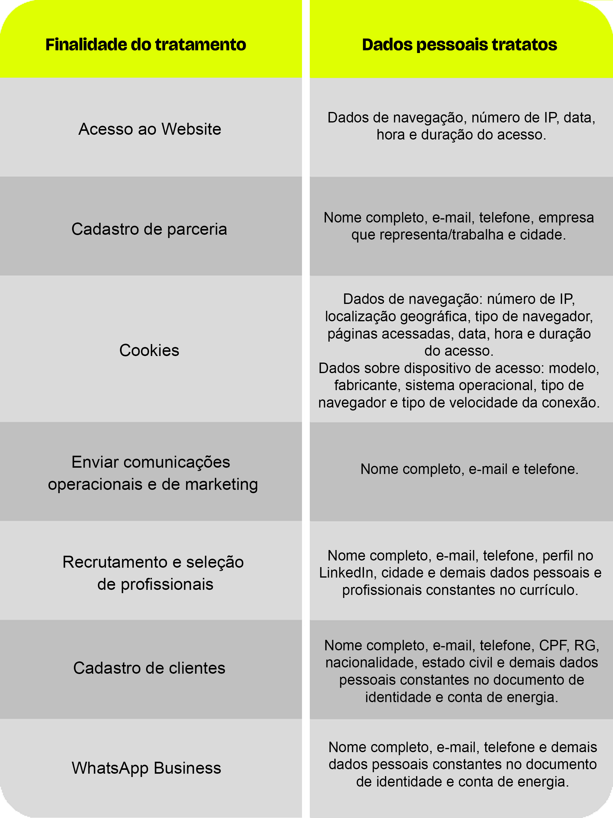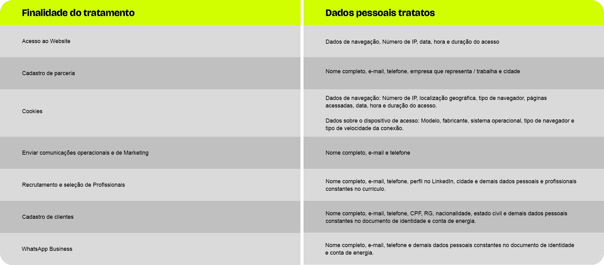 O tratamento dos Dados Pessoais está atrelado ao relacionamento do titular com a IVI Energia. Os dados utilizados serão aqueles solicitados no cadastro do Titular interessado em realização de parceria ou envio de currículo do Titular interessado em trabalhar conosco.